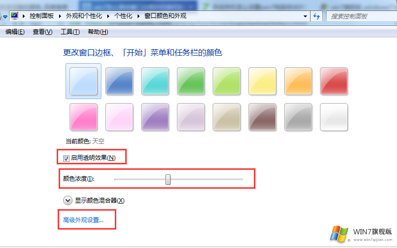 4、在这里我们可以选择我们喜欢颜色设置为窗口边框、开始菜单和任务栏的颜色,可以决定是否启动透明效果以及颜色的浓度。如果这里默认颜色您都不喜欢,可以进入“高级外观设置”中选择。