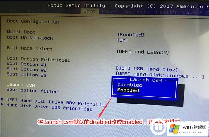 3、再将launch csm设定为Enabled,打开兼容模式,如图所示,随后再F4储存设定;