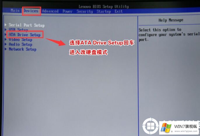 4、切将电脑键盘挪动Devices选择项,把电脑键盘挪动ATA Drive Setup回车键,将configure SATA as中默认设置的raid改为ahci方式,不然安装win7时候出現0x0000007b白屏或PE中找不到硬盘,由于win7中沒有集成化raid硬盘驱动,随后挑选F10储存设定,在弹出来的选择项中挑选YES,如图所示;