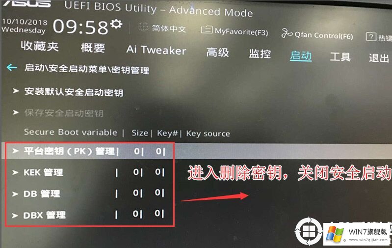 2、进到高级模式后,按→方向键挪动到"起动"选择项,挑选安全性起动莱单,随后回车键进到密钥管理消除密匙关掉安全启动;