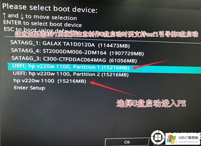 5、插进移动u盘启动盘,重新启动按ESC挑选鉴别到移动u盘启动项,回车键;